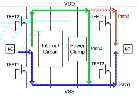 It should be mentioned that, since TFET has a relatively low positive mode ESD robustness, it cannot be used as a single protection device in an IC, but can be used to implement a protection network as shown in Figure 2, in which TFET is used to replace the traditional diode to enhance the whole chip ESD robustness. As for the pin-to-pin ESD event, their discharge paths exist in the TFET based protection network as shown in Figure 2, whereas in the traditional diode-based protection network only Path2 exists. In Path1 and Path3, TFET1 and TFET4 operate in avalanche breakdown mode with low ESD robustness. Thus, it is necessary to improve the robustness of TFET under positive ESD stress.