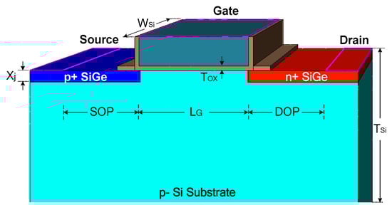 As illustrated in Figure 3, the device structure proposed in this work is identical to the conventional silicon point-tunneling TFET except that the source and the drain regions are made of SiGe. The device size is not set to a very small value for better heat dissipation [,]. The default device parameters are: Thickness of the gate oxide (HfO2) Tox = 4 nm, thickness of the silicon TSi = 1 μm, width of the device WSi = 1 μm, depth of the junction Xj = 10 nm, length of the gate LG = 100 nm, and source and the drain side silicide blocking lengths SOP = DOP = 100 nm. Silicide blocking is used in ESD protection devices to reduce the current crowding effect [,]. The doping concentrations of the source, drain, and substrate are NS = 1 × 1020 cm−3, ND = 5 × 1019 cm−3, and NSub= 1 × 1016 cm−3, respectively. Abrupt doping profile is used in the simulation. In order to avoid possible high defect density at the SiGe/Si interface, the default Ge mole fraction is set at 0.4 [].