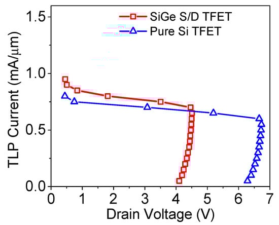The TLP I-V curves of both the SiGe S/D and Si TFETs are shown in Figure 4. The triggering voltage and failure current of the SiGe S/D TFET are 4.1 V and 0.7 mA/μm, respectively, which are 35% lower and 17% higher than those of the Si counterpart. These improved key parameters will make the new TFET easier to fit into the modern ESD design window and offer higher ESD protection capability. It should be noted that the SiGe source has nearly no influence on the ESD characteristics [], and the improvement is achieved by introducing the SiGe drain in the TFET.