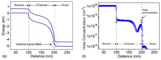 The reduction of the triggering voltage of the TFET is achieved by introducing the SiGe material in the drain region. The Ge material has the following three advantages in triggering the TFET at a lower voltage. First, Ge has a higher BTBT probability than Si due to its narrower bandgap and lower carrier effective mass. The TFET has a BTBT-assisted avalanche generation mechanism, hence a higher BTBT probability gives rise to a more significant avalanche breakdown [,]. Second, Ge has a higher impact ionization coefficient than Si under the same electric field []. This means that the critical electric field required for avalanche breakdown in the SiGe S/DTFET is lower than that in the Si TFET. Third, the drain/substrate heterojunction offers an enhanced electric field, which helps to reduce the triggering voltage []. SiGe and Si have similar electron affinities, thus the bandgap difference approximately equals the valence band offset. Figure 5a shows the energy bands of the SiGe S/D TFET stressed under a TLP current density of 0.5 mA/μm. It can be seen that there is a valence band offset at the drain/substrate interface. This obstructs the holes from moving to the source, causing some holes to accumulate on the drain side, as evidenced by the hole concentration plot shown in Figure 5b, with a significant hole density peak at a distance of 5 nm below the Si/SiO2 interface on the drain side. This leads to an enhancement in the electric field at the drain/substrate interface and consequently a reduction in the trigger voltage.