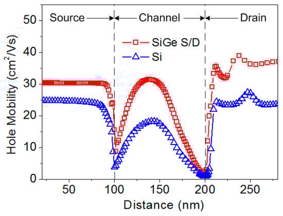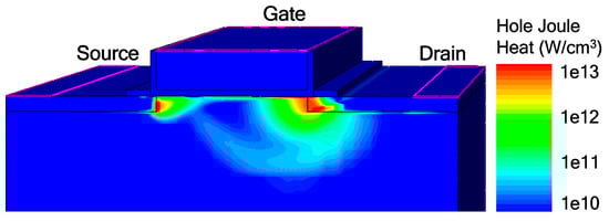 where H is the heat, J is the current density, μ is the mobility, and subscripts n and p denote electrons and holes, respectively. The hole Joule heat is higher than the electron Joule heat because the impact generated holes move from the drain interface to the source through the channel region, whereas the electrons are collected by the drain terminal without traveling. Furthermore, the high electric field and carrier scattering significantly degrade the mobility, especially near the drain and the source interfaces. These, in turn, cause a large amount of hole Joule heat generated at the interface regions as shown in Figure 6. The hole mobility in the SiGe S/D TFET is higher than that in the conventional Si TFET as shown in Figure 7. Thus, the SiGe S/D TFET has an elevated robustness due to the fact that the hole Joule heat is the dominate heat source and hole mobility in SiGe is higher than that in Si.