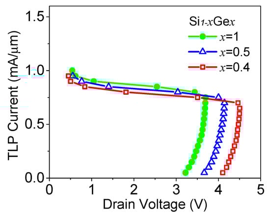 In the SiGe S/D TFET, the increase in the Ge mole fraction (x) can cause a reduction in the triggering voltage, and a slight increase in the failure current as shown in Figure 8. This trend can be easily understood from the preceding discussions. However, when the Ge mole fraction is higher than 0.4, the defect density at the SiGe/Si interface may degrade the device performance.