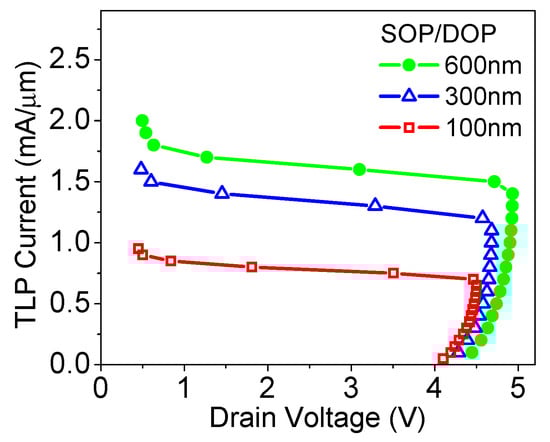 Dimensions have significant influences on the characteristics of ESD protection devices. From Figure 9, it can be seen that with a large DOP and SOP value (see Figure 1), although the triggering voltage is slightly increased, the failure current is significantly increased. This can be attributed to two reasons. The increase in device volume offers a better heat dissipation and thus a reduced temperature in the device. In addition, when DOP and SOP are increased, the series resistance in the discharge path is increased, hence the ballasting effect suppresses the current crowding along the lateral direction []. The contour plots of lattice temperature with two DOP and SOP values are shown in Figure 10.