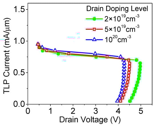 The impact of drain doping level on SiGe S/D TFET’s ESD I-V characteristic is shown in Figure 11. It can be observed that with the increase in drain doping level, the triggering voltage is reduced. This can be attributed to the enhanced BTBT, and reduction in the critical electric field required for avalanche breakdown. The failure current is slightly increased with the increase in drain doping level, and this is because the reduction in drain voltage results in less Joule heat. It should be mentioned that, since the BTBT and avalanche generations mainly occur on the drain side, the source doping level nearly does not influence the TFET’s ESD characteristics [].