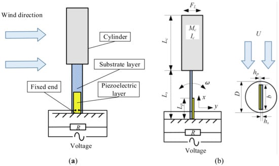 Figure 1a shows the composition of UPEH energy harvesting system. The UPEH comprises an upright piezoelectric beam with cylinder extension. The axis of the beam and the axis of the cylinder are in a straight line. The load resistance is attached to the piezoelectric layer by two electrodes. Figure 1b shows the detailed schematic of UPEH. To model UPEH energy harvesting system, the following assumptions are adopted:
