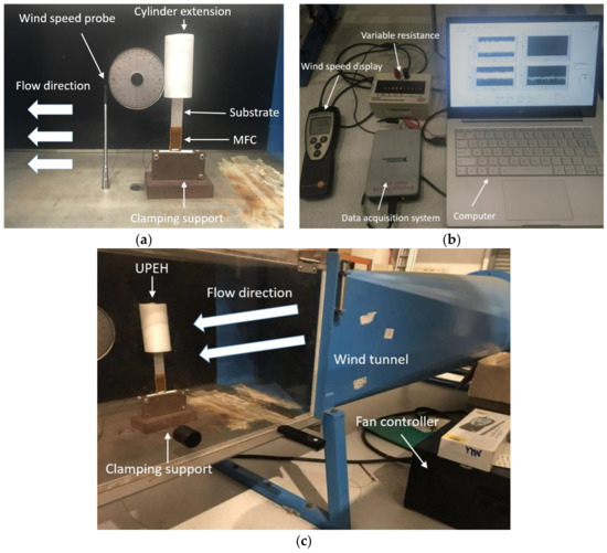Figure 2a shows the experimental setup of a UPEH prototype which is installed in a wind tunnel. The cantilever is fabricated with an aluminum substrate bonded with macro fiber composite (M-2814-P2, Smart Material GmbH, Dresden, Germany) using glue (DP-460, 3M Scotch-Weld, Singapore) from the clamped end. The tip cylinder (Art Friend, Singapore) is made of light foam and bonded with the cantilever by glue. Figure 2b shows the power acquisition system and Figure 2c shows the wind tunnel. The experiments were carried out in the working section of the wind tunnel. The frequency controller of the wind tunnel can change the rotational speed of fans at the end of the wind tunnel, and, thus, change the wind speed. The experiments are carried out at discrete wind speeds. The wind speed is linearly increased/decreased slowly between successive wind speeds, and the transient changing region of wind speed is not taken into consideration in this experiment. The flowing direction of the wind is in the width direction of the cantilever. An adjustable external electrical resistance is used to investigate the influence of resistance on the output performance of energy harvester. The wind speed is measured in real-time by an anemometer (testo 425, Testo SE & Co. KGaA, Lenzkirch, Germany). The voltage across the load resistance is measured by DAQ module (NI 9229, National Instruments, Austin, TX, USA) and processed by LabVIEW software. A computer is utilized to record and store the voltage signal. The average output power on load resistance is calculated by P=V2RMS/R where the RMS voltage is the root mean square voltage. The mechanical damping ratio can be acquired using the logarithmic decrement method by the free vibrating test. The detailed values of the physical properties of the energy harvesting system are listed in Table 1.