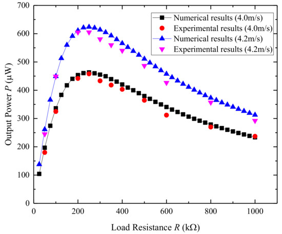 For investigating the maximum performance of harvesting energy, the load resistance should be taken into consideration. Figure 3 shows the numerical results, and experimental results of the average output power P versus load resistance R. The powers are measured at a wind speed of 4.0 m/s and 4.2 m/s, respectively. It can be found that with the increase of the load resistance value, the average output power increases first until it reaches the maximum value and then decrease. The value of the resistance when the output power is largest is called the optimum resistance. From Figure 3, we can observe that there is an optimal resistance around 250 kΩ for both wind speeds. The optimum resistance for an energy harvester has little relationship with wind speed. The optimum resistance of experimental results is consistent with that of the numerical analysis.