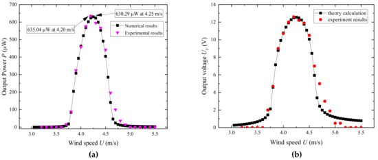 To investigate the effect of wind speed U, output powers across the load resistance at various wind speeds were measured and calculated. Both numerical and experimental resistances were set to 250 kΩ, which is assumed to be the optimum resistance for the proposed configuration. Figure 4 shows the average output power and the output voltage versus the wind speed, respectively. From both results, we can observe that with a wind speed increase, output power P first increases until it reaches the maximum Pmax and then decreases to almost zero. The reason for this result is that there is a positive correlation between the vortex shedding frequency and wind speed. With a wind speed increase, the frequency of vortex shedding increases gradually close to the natural frequency of UPEH. The lift force of vortex pushes the cylinder into the resonance region and, thus enhances the vibration amplitude. As a result, the harvester generates much more power. When the wind velocity exceeds a certain value, the frequency of the vortex shedding exceeds the natural frequency of the cylinder, and little output power can be generated even if the lift force is greater. The maximum average output power P is 635.04 µW when the wind speed U is 4.2 m/s as obtained in the experiment. The theoretical maximum average output power calculated through the prediction model is 630.29 µW when the wind speed U is 4.25 m/s. Meanwhile, the presented theory also predicts the synchronization region well. The theoretical starting and ending wind speeds for energy harvesting are 3.75 m/s and 4.7 m/s, respectively While the starting and ending wind speeds obtained from experimental results were 3.7 m/s and 4.8 m/s, respectively. There is in good agreement between the theoretical and experimental results both in the maximum output energy and the synchronization region. It proves the validity of the theoretical model.