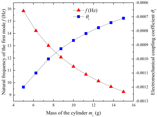 Influence of cylinder mass on the first mode frequency and electromechanical coupling coefficient.