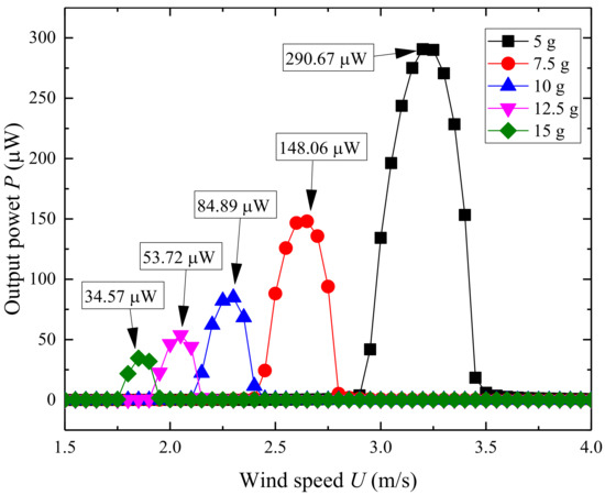Output power of UPEH versus wind speed with different mass of cylinder.