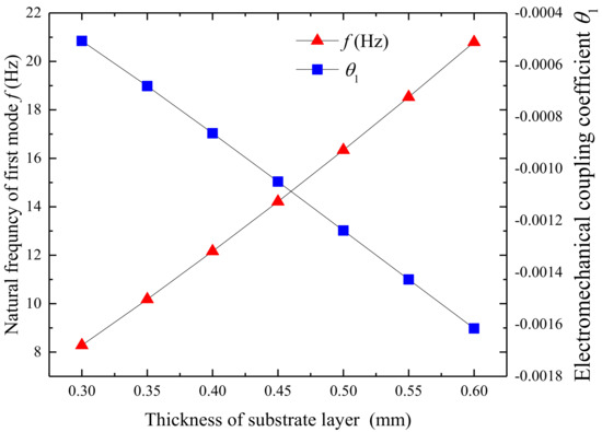 Variation of the first natural frequency and electromechanical coupling coefficient of UPEH as a function of the thickness of substrate layer.