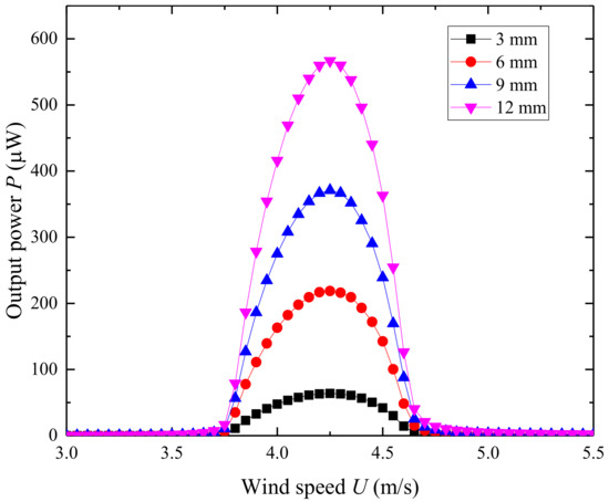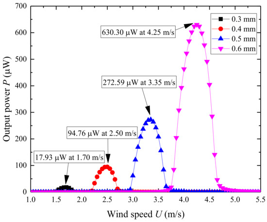 Figure 7 shows the variation of the first natural frequency of UPEH and electromechanical coupling coefficient as a function of the thickness of the substrate layer. The first natural frequency of the UPEH is increased from 8.28 Hz to 20.79 Hz, and electromechanical coupling coefficient changes from −0.0005 to −0.0016 as the thickness of the substrate layer increases from 0.3 mm to 0.6 mm. A higher first natural frequency results in a larger corresponding wind speed region. As a result, the resonant wind speed is increased from 1.70 m/s to 4.25 m/s, as shown in Figure 8. The maximum output power is also increased from 17.93 µW to 630.29 µW because the lift force on the attached cylinder increases with higher resonant wind speed. The thickness of the substrate also makes an impact on the working bandwidth of wind speed. A greater thickness of the substrate layer results in a wider bandwidth. As a result, the UPEH can get better output power performance with a thicker substrate in the corresponding wind speed region.