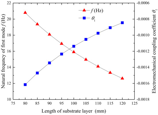 Variation of the first natural frequency and electromechanical coupling coefficient of UPEH as a function of the length of substrate layer.