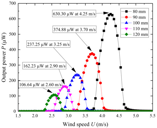 Figure 9 illustrates the changes of the first natural frequency and electromechanical coupling coefficient relating to the length of the substrate layer. Figure 10 illustrates the output power of the UPEH as a function of wind speed. The first natural frequency is 20.79 Hz when the length of the substrate layer is 80 mm, while it is 12.61 Hz when the length of the substrate layer is 120 mm. The electromechanical coupling coefficient changes from −0.0016 to −0.0008. The length of the substrate has little effect on the width of the synchronization region. The maximum output power also decreases from 630.30 µW to 106.64 µW when the length of the substrate layer changes from 80 mm to 120 mm. The main reason for this result is that a longer substrate leads to a lower natural frequency. The results show that an energy harvester with a shorter substrate can provide better output power performance than with a longer substrate within the length range of this study.