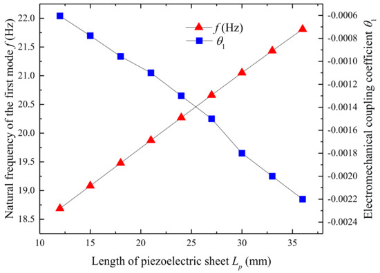 Variation of the first natural frequency and electromechanical coupling coefficient as a function of the length of piezoelectric sheet.
