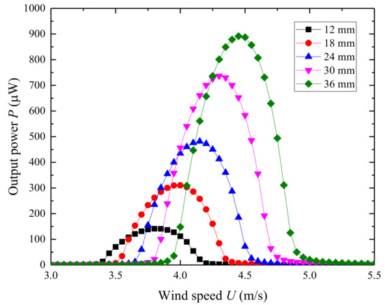 Figure 11 shows the effects of the length of the piezoelectric sheet on the natural frequency and electromechanical coupling coefficient. The natural frequency increases from 18.69 Hz to 21.81 Hz and the electromechanical coupling coefficient varies from −0.0006 to −0.0022 as the length of the piezoelectric sheet changes from 12 mm to 36 mm. The results show that the length of the piezoelectric sheet has a distinct influence on the natural frequency of the UPEH. Figure 12 illustrates the output power relating to the length of the piezoelectric sheet. The maximum output power varies from 141.23 µW at a wind speed of 3.80 m/s when the length of the piezoelectric sheet is 12mm to 891.69 µW at a wind speed of 4.45 m/s when the length is 36mm. The main reasons for the results are the higher natural frequency and higher electromechanical coupling coefficient.