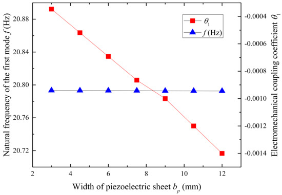 Variation of the first natural frequency and electromechanical coupling coefficient as a function of the width of piezoelectric sheet.