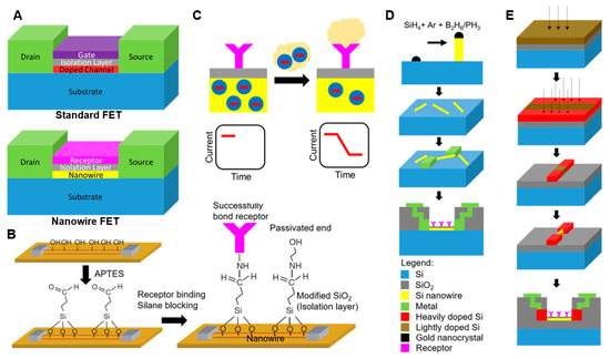 Conceptual overview of field effect transistors (FET) (adopted with permission from [24]). (A) Schematics illustrating the differences between standard and nanowire field-effect transistors. (B) An overview of the functionalization process of the nanowire (based on 3-aminopropoyltriethoxysilane (APTES)). The APTES converts the silicon–oxygen bonds into a silane layer, after which, it becomes possible to bind this layer with several receptors (adopted with permission from [31]). (C) Illustrates the operating principles of nanowire sensors. The charged molecules captured by the receptors induce variations in the conductivity of nanowire (there is either an increase or a decrease in the current that passes through it). The nanowire sensors fabricated using (D) the bottom-up approach and (E) the top-down approach.