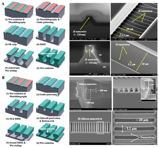 Another silicon nanowire fabrication process using a top-down process based on bulk SCS wafer is shown in Figure 2. Generally, the fabrication is performed with combined processes of typical semiconductor manufacturing process, which uses photolithography, silicon dry etching, anisotropic wet etching, and thermal oxidation [51,52,53]. In these top-down fabrication methods, the width of the silicon nanowires is controlled by the thermal wet oxidation time. Its result is organized silicon nanowires. The schematics of the fabrication processes of (100)- and (111)-oriented SCS wafer are illustrated in Figure 2A,B respectively. For the (100)-silicon fabrication process, a 1000-Å-thick silicon dioxide is grown on the boron-doped silicon substrate using a thermal oxidation process. After photolithographic definition of the space and line, the silicon dioxide at the top layer is etched by the dielectric etching process. Then, photoresists are removed, and cleaning processes are performed. Then, the silicon deep RIE etching process is performed to define the rectangular-structured columns, where the silicon nanowires are located. Subsequently, anisotropic silicon wet etching process, using tetramethylammonium hydroxide (TMAH) solution, is carried on until the {111}-plane of the silicon surface is exposed. As shown in the Figure 2A, the hourglass-shaped silicon structures are fabricated, exposing the etch-stop {111}-surfaces. The arrayed silicon nanowire structures are fabricated by a thermal oxidation process, in which the upper layers of the hourglass structures are the silicon nanowires, and are isolated by the thermal oxide between the upper and lower layer. The height of the nanowire is determined by the photolithographic pattern width, which is an inherent property of the SCS wafer. The top-down (111)-silicon nanowire fabrication also starts with the thermal oxide growth process. Then, photolithography and dielectric etching processes are performed to define the line and space patterns. The primary deep silicon RIE process is performed for defining the height of the silicon nanowire. For (111)-silicon nanowires, the height and the width of the structures are defined separately, which can result in various structures, such as wires and ribbons. Then, thermal oxidation process is performed for passivation of the sidewalls of the whole structures. The plasma-enhanced anisotropic dielectric dry etching process is performed to expose the bottom surface of the structure, and secondary deep silicon RIE process is performed to fabricate the sacrificial layer. Subsequently, an anisotropic silicon wet etching process by TMAH solution is followed to reveal the {111}-planes. Finally, the thermal oxidation process is performed to fabricate the arrayed rectangular nanowire structures, after the passivated silicon dioxide layers’ removal.