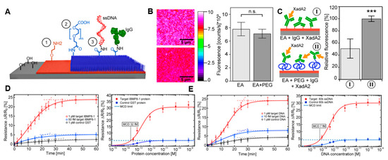 Generalized strategy for ultrasensitive detection of protein and DNA using nanowires (adopted with permission from [62]). (A) Schematic representing the functionalization process to allow high sensitivity. (1) Coupling ethanolamine to the surface; (2) attaching PEG cross-linker; (3) binding of biomolecules by peptide-binding. (B) False-colored image of fluorophore antibodies bound to the ethanolamine and PEGylated surfaces. No statistical difference was found on the amount of fluorescence. (C) PEGylated surface has higher relative fluorescence. The schematic illustrated the spacing introduced by PEG significantly improved the binding efficiency of antibodies. (D,E) Detection of protein antigen (D) and ssDNA (E) using the developed devices. The LOD is 6 fM and 1 fM for protein and ssDNA, respectively.