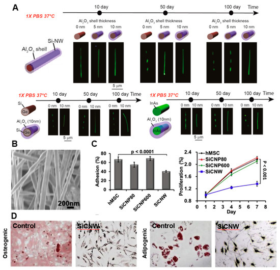 Design nanowires for in vivo sensing. (A) Improving long-term stability by Al2O3 shell coating (adopted with permission from [89]). (B–D) Cytotoxic effects of SiC nanowires to cell behavior and differentiation (adopted with permission from [89]). (B) SEM pictures of SiC nanowires. (C) Quantification of adhesion and proliferation of hMSCs on nanowires and nanoparticles. (D) Quantification of differentiation potency of hMSCs on SiC nanowires. Alizarin Red S and Oil Red O stain was utilized to quantify the differentiation toward osteogenic and adipogenic lineage, respectively.