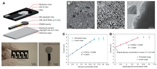 Integrate nanowires with disposable devices (adopted with permission from [97]). (A) Schematic and photograph of paper-based analytical devices (PADs) with ZnO nanowires. (B) Characterization of ZnO nanowires. From left to right: (1) SEM image of rough carbon surface before the growth of nanowire; (2) SEM image of nanostructured carbon surface with deposited ZnO nanowires; (3) TEM image for quantification of nanowires. (C) Calibration of sensor (output current vs. glucose concentration) in buffer. (D) Quantification of detected limits and linear range of the PADs in serum.