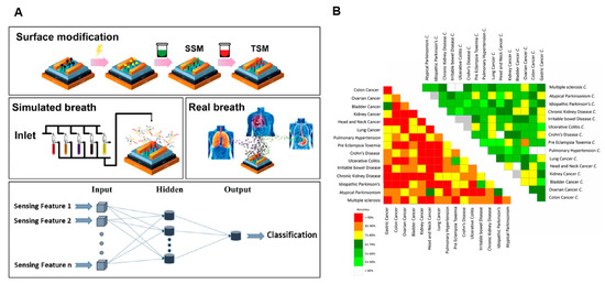 Signal processing strategy for multivariable nanowire biosensors. (A) Disease diagnostics based on machine learning: multivariable nanowire sensors were utilized to provide input for artificial neural networks (adopted with permission from [112]). (B) Big data strategy to correlate exhaled molecules detection by nanowire sensors with specific disease (adopted with permission from [113]).