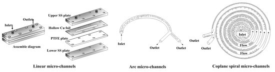 Since the 1990s, studies on micro-fluid systems have gradually increased in popularity and micro-channels have drawn worldwide attention due to their unique flow pattern, high surface area and process intensification [1,2,3]. Micro-channel reactors [4,5], micro-mixers [6,7], and micro heat pipes [4] have been studied extensively and applied in the chemical industry [8,9]. To date, extensive literatures indicate that micro-channels can make chemical processes more efficient, environmentally friendly, and safe [10,11].