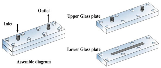 The transparent asymmetry plate-type micro-channel apparatus was composed of two stacked glass plates, one hydrophobic upper plate and one hydrophilic lower plate, sealed with eight peripheral tightened bolts, as shown in Figure 2. The assemble procedures of micro-channel are described as follows, and the glass surface modifying method is referred to in [22].