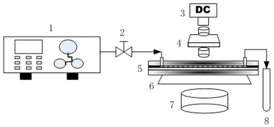 Figure 3. Schematic diagram of the visual demulsification experimental system with TAPM. Components include: 1, constant flow pump; 2, needle valves; 3, digital camera; 4, objective; 5, transparent asymmetric plate-type micro-channel; 6, objective table; 7, light source; 8, sample collecting tube.