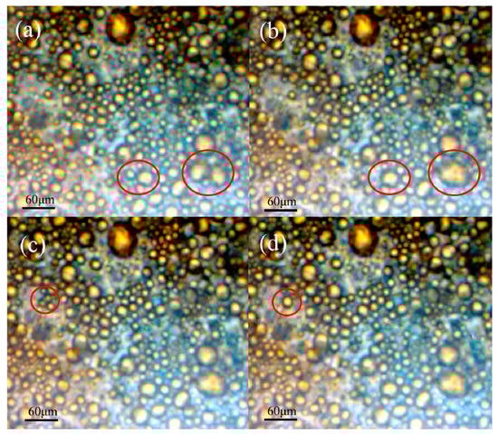 Furthermore, the video screenshots illustrated that the adsorbed droplets coalesced with each other on the plate, as shown in the red circles of Figure 4. There were two pairs of droplets in Figure 4a, 21.4 μm and 23.9 μm, 15.6 μm, and 26.3 μm in diameter, which merged into two larger droplets after 0.1 s in Figure 4b. In Figure 4c three droplets with diameters of 9.7 μm, 6.7 μm, and 7.7 μm merged into a 17.8 μm-diameter droplet after 0.1 s in Figure 4d. These results confirmed that oil droplets can be adsorbed and undergo binary and triple coalescence upon the hydrophobic wall of TAPM. This provided visual evidence of adsorption and coalescence of oil droplets in the APM, consistent with the “confined coalescence mechanism”.