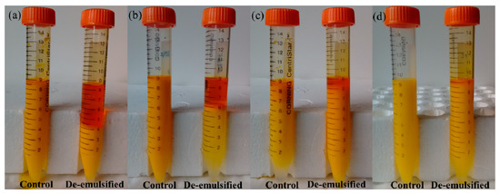The de-emulsified emulsions summarized in Table 3 were collected into centrifuge tubes and are shown in Figure 6. De-emulsified emulsions I, II, and III (right of each pair) were compared with the controls (left of each pair). The controls were prepared in the same way but not pumped through TAPM.