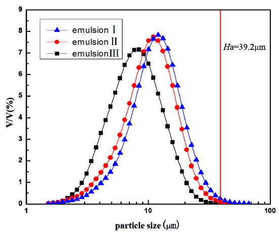 Sudan red I (1.0 mg/mL) kerosene solution, water and mixing emulsifiers (Span80 and Tween80) were homogenized by High speed dispersed homogenizer (FJ-200, Shanghai Specimen and Model Factory, Shanghai, China) agitation at 10,000 rpm for 2 min. Emulsions with three different oil-to-water ratios were prepared (emulsions I, II, and III), as shown in Table 2, and the droplet size distributions of the emulsions were measured using a laser particle size analyzer (Rise-2006, Jinan Rise Co., Ltd., Jinan, China). All the emulsions prepared proved to be k/w emulsions by the dilution method.