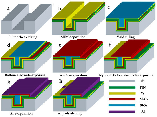 - Klootwijk, J.H.; Jinesh, K.B.; Dekkers, W.; Verhoeven, J.F.; Heuvel, F.C.; Kim, H.D.; Blin, D.; Verheijen, M.A.; Weemaes, R.G.; Kaiser, M.; et al. Ultrahigh capacitance density for multiple ALD-grown MIM capacitor stacks in 3-D silicon. IEEE Electron Device Lett. 2008, 29, 740–742. [Google Scholar] [CrossRef]