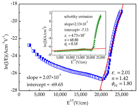 - Khaldi, O.; Jomni, F.; Gonon, P.; Mannequin, C.; Yangui, B. Investigation of electrical properties of HfO2 metal-insulator-metal (MIM) devices. Appl. Phys. A 2014, 116, 1647–1653. [Google Scholar] [CrossRef]