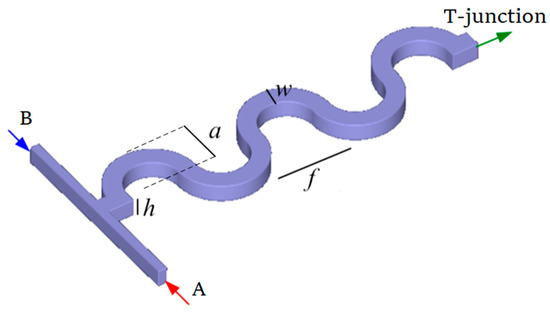The physical model (see Figure 1) comprises a micro-wavy-channel design for which liquid A enters the channel from the right inlet (red arrow in Figure 1), while liquid B flows from the left inlet (blue arrow in Figure 1). Liquids A and B mix in the opposing streams in a T-junction. The channel height (h), width (w), wavy frequency (f) and wavy amplitude (a) are varied according to the Taguchi array. For comparison purposes, we keep the length the same for all cases.