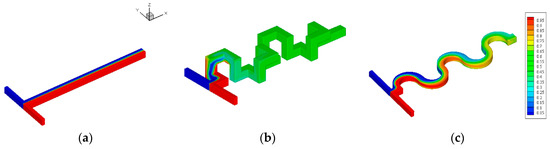 Mixing performance of micromixer T-junction designs. (a) Conventional straight; (b) Complex 3D serpentine; (c) Wavy microchannel.