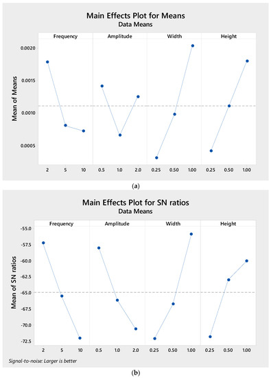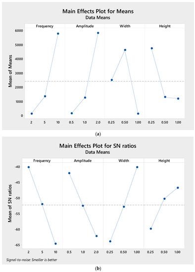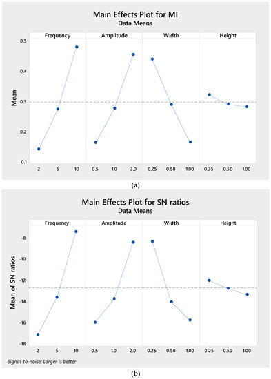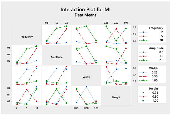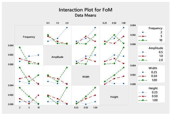 Looking further to the sensitivity response of S/N ratio for each parameter in Figure 7, it reveals that the trend is similar to that in pumping power: lower wavy frequency, shorter wavy amplitude, longer microchannel width and longer microchannel height. Turning our attention to the interaction of each factor, Figure 8 depicts a significant interaction between frequency and amplitude with all parameters at different levels, while the interaction between channel width and height is marginal.