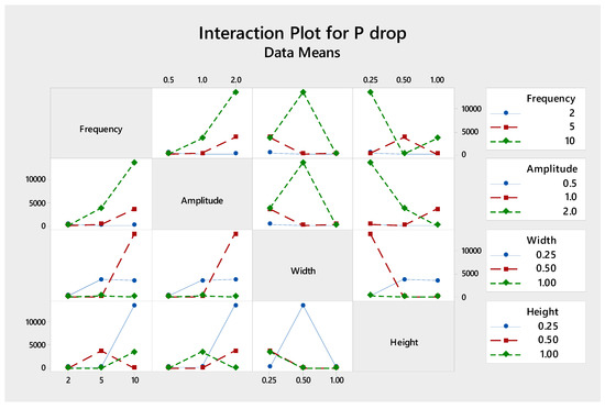 Looking at the interaction of each factor in Figure 6, it is found that significant interaction is obtained between channel height and frequency, channel width and amplitude, and channel height and width, which is reflected by interaction of L and D in Darcy friction loss equation.