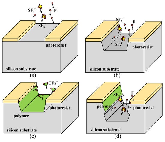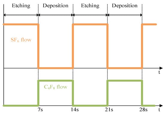 The silicon substrate is isotropically etched by these active particles shown in Figure 1b. Ar gas stabilizes the glow discharge in ICP-RIE system. Ten percent O2 as an assistant gas prohibits the combinations of active radical sites SFx and F in plasma chamber. Additionally, O2 can also provide oxygen in the passivation layer. At the same time, physical sputtering of neutral particles also exists []. Then, during the passivation step, a type of fluorocarbon gas like C4F8 is used to grow a thin protection film of nearly 10 nm. This fluoride polymer impedes the reaction between F radical sites and Si substrate shown in Figure 1c. During the next etching cycle, the lateral polymer persists due to the low impact probability of directional ions while the bottom polymer is removed. By alternating the etching and passivation period in Figure 2, the direction of etching will only occur along the vertical side shown in Figure 1d.