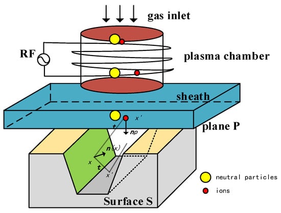 where the neutral and ionic reactants are introduced in source plane P. The angle distribution is distinguished by parameter α in Equation (1). In terms of ions, α is about 100, which presents the Gaussian-like distribution. The neutral particles correspond to cosine-like distribution since α = 1 []. Additional, here is total fluxes of ions and neutrals, denotes incident direction and is the vertical vector pointing to surface S, f(E) is the distribution function of energy.