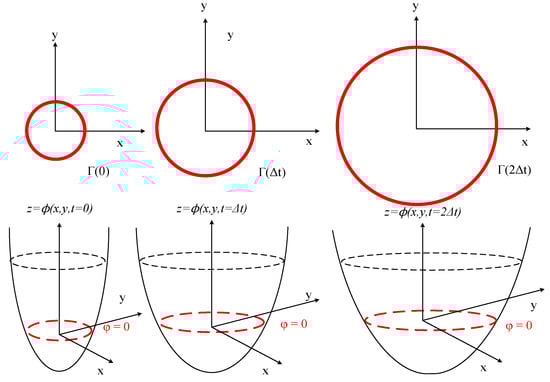 Considering a moving hypersurface , embedded in a one-dimensional higher time dependent level set function . And the boundaries are always determined as the zero level set in Equation (4) shown in the Figure 4:
