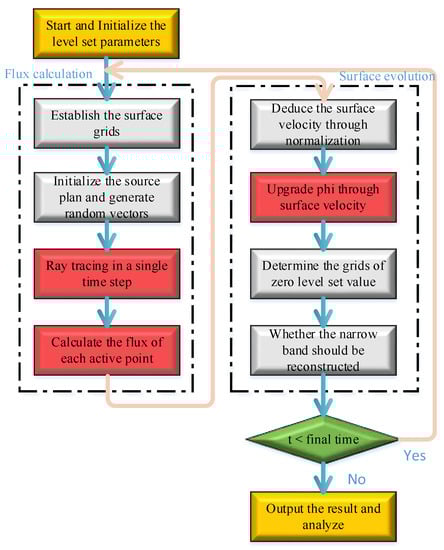 The flowchart which couples LS-MC are demonstrated in the Figure 7. The time step is not a constant restrained by CFL condition Equation (11). In other words, the time steps are dependent on the maximum velocity in all active grids. And in each step, the maximum velocity is varied owing to the randomicity of Monte Carlo: