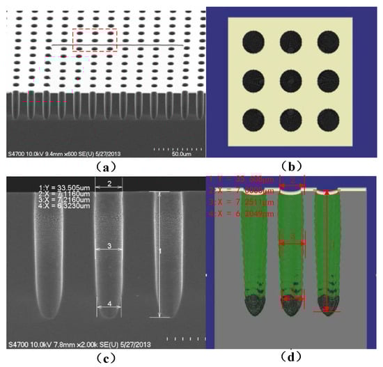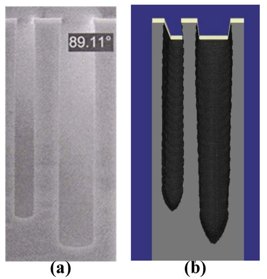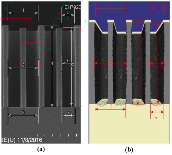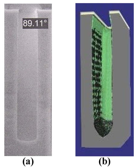 The second experiment is to etch the deep trenches on a specified wafer [,]. SOI wafer (silicon on insulator) is composed of two silicon layers with one silicon dioxide layer inside. The top layer called device layer will be etched to establish the complex structures. Due to the isolation of silicon dioxide, the reactive ion etching stops at the interface. The experimental and simulation results are shown in the Figure 11. From the 3-D simulation result Figure 11b, the interface is rough because of the particles sputtering. And the typical sizes of trenches and aspect ratio are given in Table 3. The average error of simulation compared with the experiments is 2.419%.
