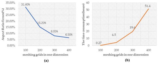 The simulation accuracy and runtime are strongly dependent on meshing. In this simulator, we can implement the same simulation with different resolution. Usually the grids range from 50 to 500 in each direction. Based on the layout of porous structure in Figure 10, the dimension is 50 μm × 50 μm × 50 μm. The 100, 200, 300, and 400 grids are chosen to simulate at the same physical parameters. Figure 12 shows that the aspect ratio errors and time consumption changes in different resolution. As a result, we choose 300 × 300 × 300 as the final simulation domain with high-precision and acceptable runtime.