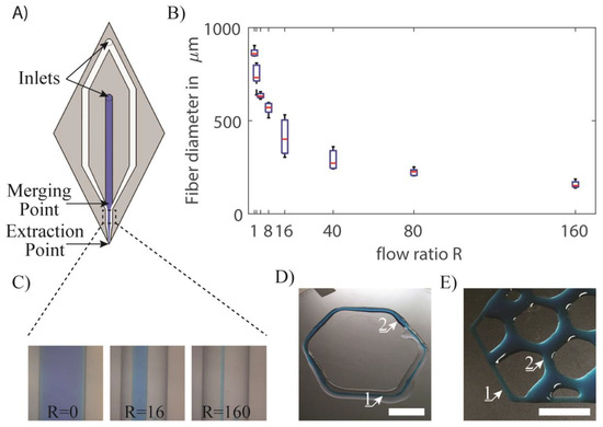 Microfluidic flows present a laminar behavior [45]. This property can be exploited to change the resolution of the printed material by focusing it while it is dispensed using sheath flows [25]. Hydrodynamic focusing only requires a very rudimentary microfluidic setup, the most common configuration being a 3-channel device, where the center flow stream is pinched between two side flow streams, resulting in a shrinking of the width of the center flow. Implementing hydrodynamic focusing in the print head of an extrusion-based 3D printer, its resolution can be not only be significantly increased, but it can be adjusted while printing by simply varying the ratio between the core and lateral flows. Figure 2A demonstrates the principle of sheath flow. Alginate filaments (in blue) are focused using de-ionized (DI) water with 4% CaCl2. Depending on the ratio of the alginate core flow to the CaCl2 solution sheath flow (Figure 2B), the obtained filaments can vary in diameter from 800 µm to below 200 µm, providing a fivefold resolution increase. Figure 2C shows the evolution of the size of the deposited filaments as a function of the ratio between sheath and core flows.