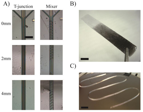 Herrigbone micro-mixer integrated at the tip of the probe. (A) Colored glycerol streams pushed through a simple T-junction and through a herringbone micro-mixer at 0 mm, 2 mm and 4 mm after the merging point. The mixer allows rapid and efficient mixing of viscous materials. Scale bar = 300 µm. (B) Mixing of white and black Formlabs resins at different ratios results in smooth gradients from one material to the other Scale bar = 1 cm. (C) Printed acrylate filament made using a two-component material. Scale bar = 1 cm.