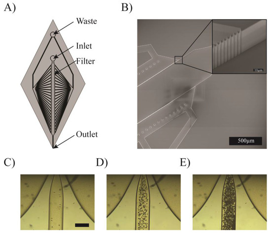 In the previous paragraphs, print heads based on very simple microfluidic components were presented; however, microfabrication techniques can be used to manufacture much more complex structures. In this paragraph, we demonstrate a print head allowing the concentration of particles in solution, which can be used to increase the filler concentration of a composite resin just before it is printed or to concentrate cells in bioprinting. Figure 4A shows a schematic of the print head. A solution containing particles or cells enters the device by the inlet and flows in a straight channel equipped with a crossflow filter towards the outlet. This crossflow filter allows some of the liquid to be withdrawn between inlet and outlet simply by adequately imposing the flows both at the inlet and the waste outlet, thus concentrating the particles in solution. The extracted liquid is removed from the device through the waste outlet, while the concentrated solution is 3D printed. To separate micrometric-sized particles, the crossflow filter must feature small openings. This is made by a series of 50 µm tall, 2 µm wide pillars with a 4 µm pitch, as shown in Figure 4B. This structure is fabricated in a single etching step. Figure 4C–E demonstrates the concentration of a solution containing 8 µm beads.