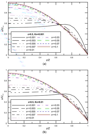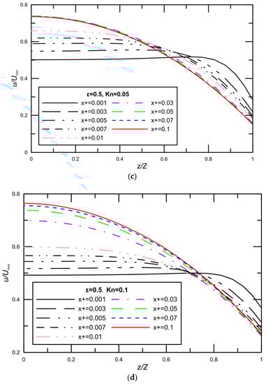 The development of the three dimensional, laminar velocity profiles in the entrance region of a rectangular duct are investigated, the velocity profiles for aspect ratio with varying Knudsen numbers are shown in Figure 2. The plots are normalized in the streamwise direction x with the microchannel width on the z-axis, and with the theoretical maximum centerline fully-developed axial velocity on the x-axis . This figure shows the three-dimensional structures of different velocity profiles in their deformation from a uniform inlet velocity profile to a parabola with the minimum velocity in the core region and maximum velocity at the wall. It is found that if the axial velocity profile at the inlet is uniform, it subsequently develops overshoots, and this is clearly observed in Figure 2. The phenomenon leading to the velocity overshoots may be explained as follows. Near the entrance where the fluid particles first meet the wall, viscous friction rapidly decelerates the flow to zero velocity at the wall. The high velocity gradient at the wall results in a high shear stress and the high pressure gradient needed to produce the high acceleration in the near wall region. Therefore, the flow near the centerline is not accelerated immediately, whereas the flow near the wall is forced to be stationary as soon as it enters the entrance region. The velocity overshoots are thus formed in order to satisfy the continuity equation. The effects of the on the velocity profile at the developing region are also analyzed. For high = 0.1 there are still slight overshoots at the axial locations close to the inlet. Additionally, note that the amount of slip velocity at a given decreases as the flow approaches the fully-developed region due to the reduction in the velocity gradients at the wall. Furthermore, increasing causes to decreasing maximum velocity at the middle of microchannel, but the velocity near the wall augments due to an increase in the slip velocity. At a given flow rate, the velocity profiles in a microchannel for high are more uniform than low .
