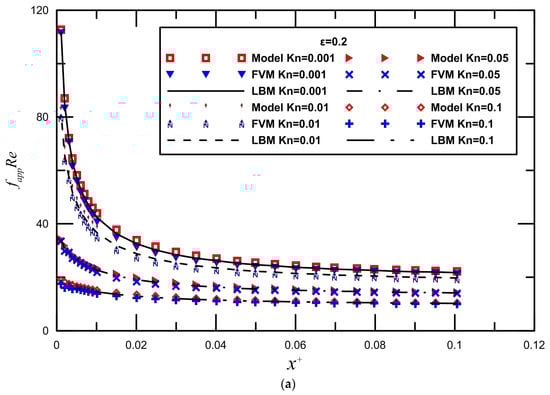 In this part, we use the calculated results from Equation (10) in Duan and Muzychka [45] as the reference to compare with present study. We also present a comparison between the finite volume method and LBM, as extracted from numerical data. To take into account the entrance effects on the overall friction factor in the microchannel, the dimensionless developing length is the proper parameter.